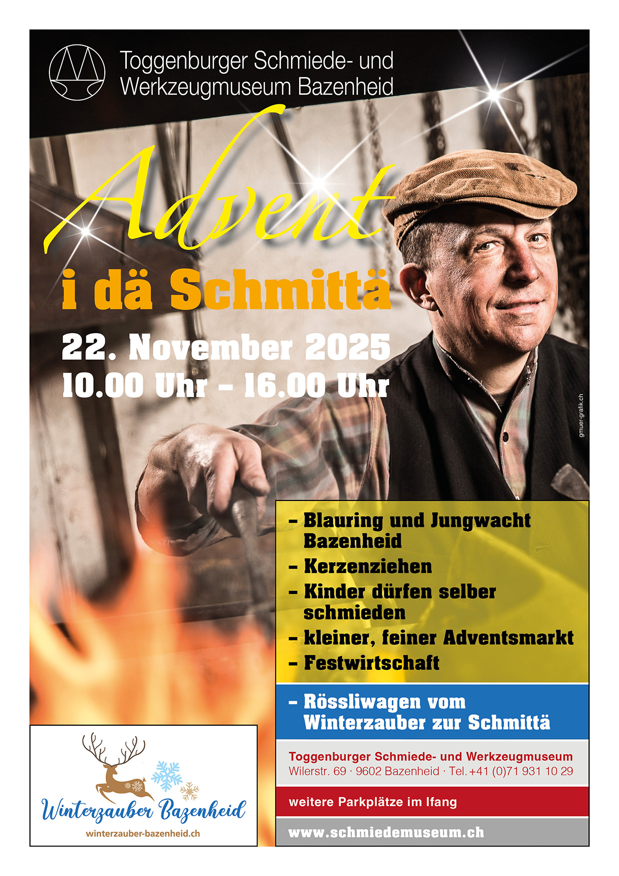 Advent i dä Schmittä! Schon sehr traditionell, dürfen wir Dich wieder herzlich einladen unseren kleinen, aber feinen Adventsmarkt zu besuchen. Blauring und Jungwacht Bazenheid werden mit den Kindern Kerzen ziehen. Richard Hasler und sein Schmiede-Team freuen sich, wenn Sie ihnen beim Schmieden über die Schulter schauen. Lust auf ein feines Raclette? Der Rössliwagen pendelt vom Winterzauber zum Adventsmarkt und zurück. Wir freuen uns sehr wieder ein Teil des Winterzauber Bazenheid zu sein.